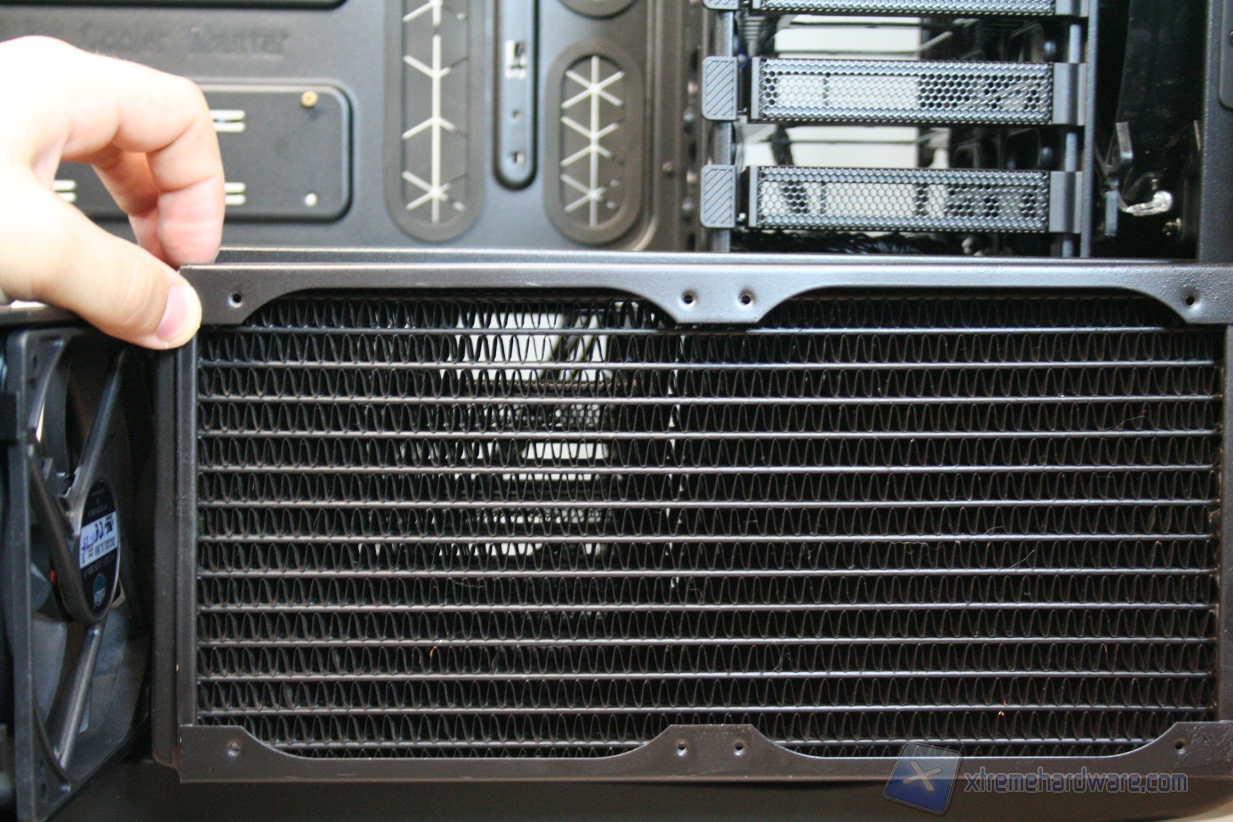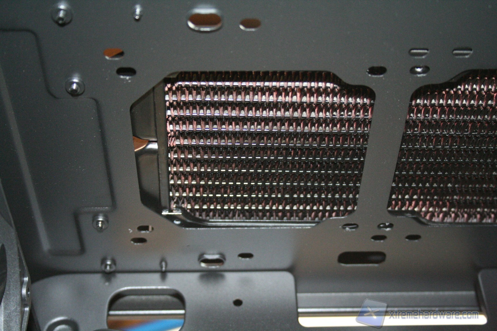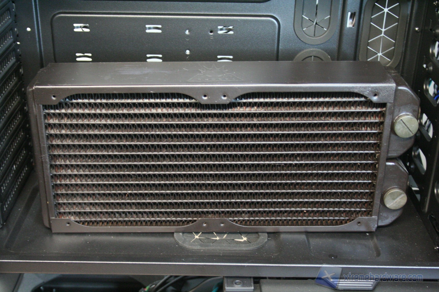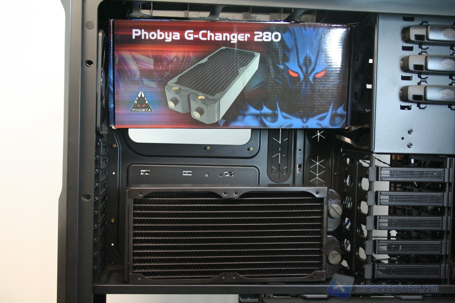 Per quanto riguarda il Phobya invece è possibile integrarlo nella stessa posizione dell’Alphacool, ma non superiormente, per via del fatto che collide con la struttura che tiene fermo il pannello superiore, similmente a quanto accaduto con l’Alphacool. Una volta fissato occupa moltissimo spazio, ma è indubbio che questo sistema permetterà prestazioni eccellenti. Da notare che putroppo i fori nella paratia superiore (quelli per il passaggio dell’aria) sono da 120mm e quindi il beneficio di un radiatore da 280mm sarebbe limitato da questo particolare. Anche in questo caso sarebbe opportuno apportare delle modifiche al pannello superiore, magari con l’ausilio di un Dremel. Occorre inoltre riporre particolare attenzione con radiatori dall'elevato spessore per la compatibilità con i moduli RAM, i quali potrebbero scontrarsi con l'estermità inferiore del radiatore o di eventuali ventole in push aggiuntive.