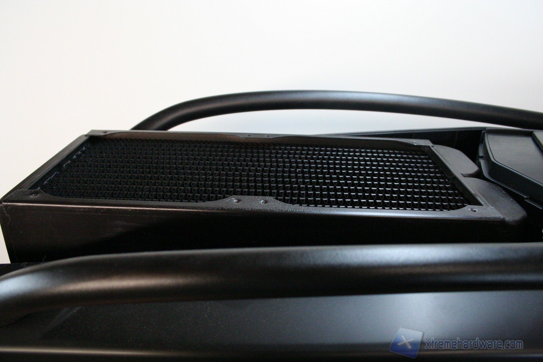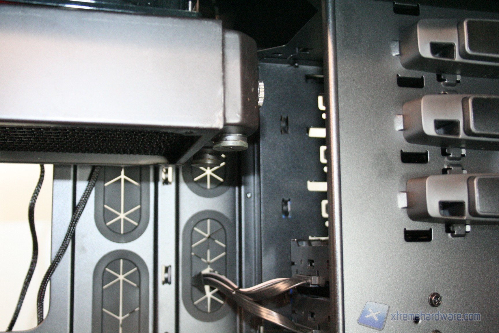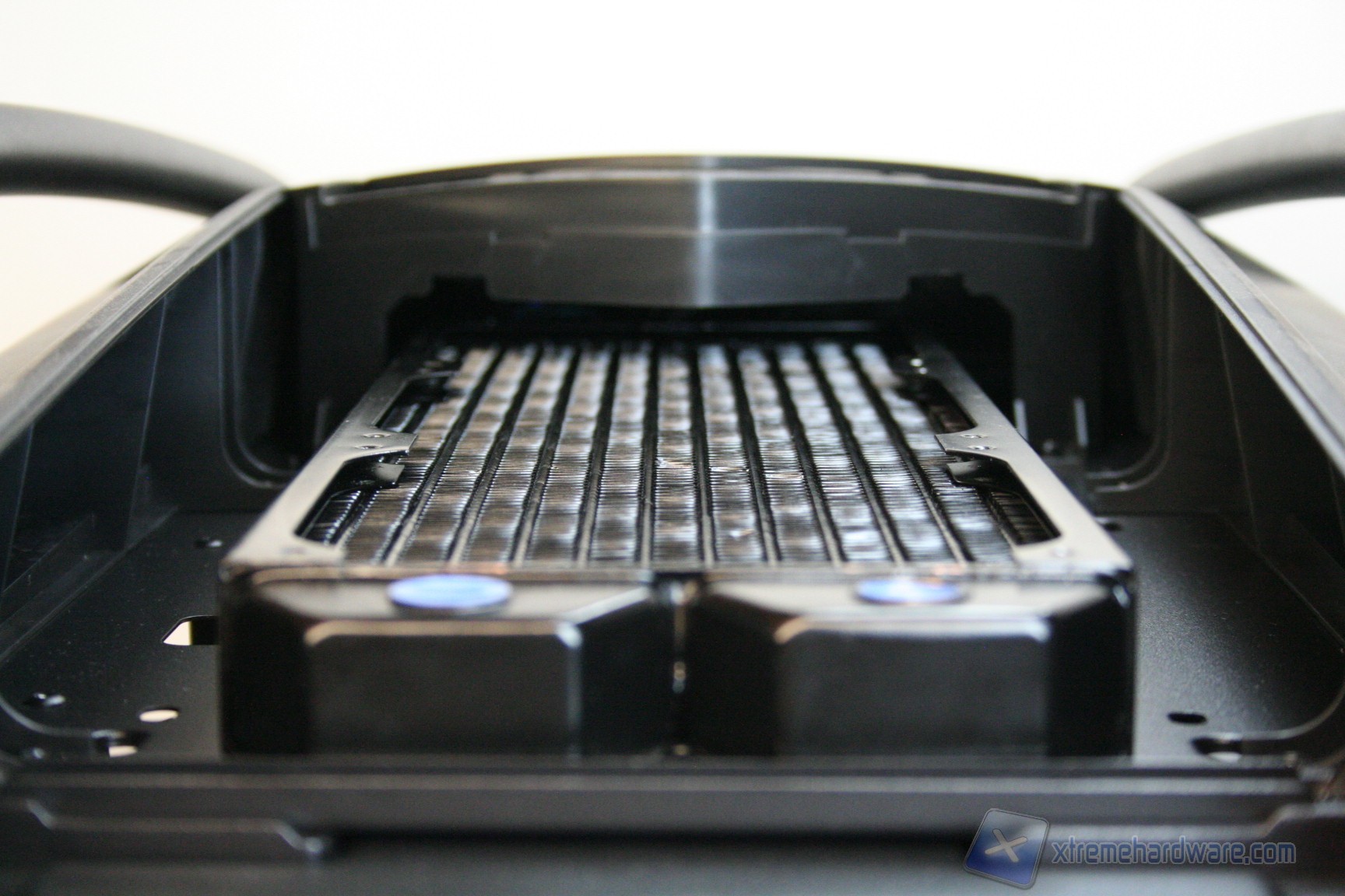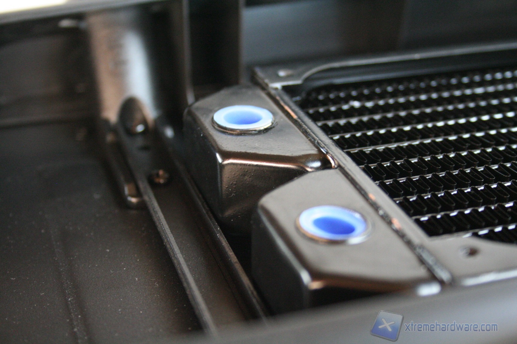 Per quanto riguarda il Phobya invece è possibile integrarlo nella stessa posizione dell’Alphacool, ma non superiormente, per via del fatto che collide con la struttura che tiene fermo il pannello superiore, similmente a quanto accaduto con l’Alphacool. Una volta fissato occupa moltissimo spazio, ma è indubbio che questo sistema permetterà prestazioni eccellenti. Da notare che putroppo i fori nella paratia superiore (quelli per il passaggio dell’aria) sono da 120mm e quindi il beneficio di un radiatore da 280mm sarebbe limitato da questo particolare. Anche in questo caso sarebbe opportuno apportare delle modifiche al pannello superiore, magari con l’ausilio di un Dremel. Occorre inoltre riporre particolare attenzione con radiatori dall'elevato spessore per la compatibilità con i moduli RAM, i quali potrebbero scontrarsi con l'estermità inferiore del radiatore o di eventuali ventole in push aggiuntive.